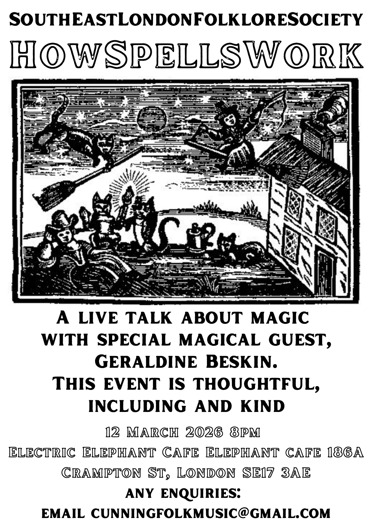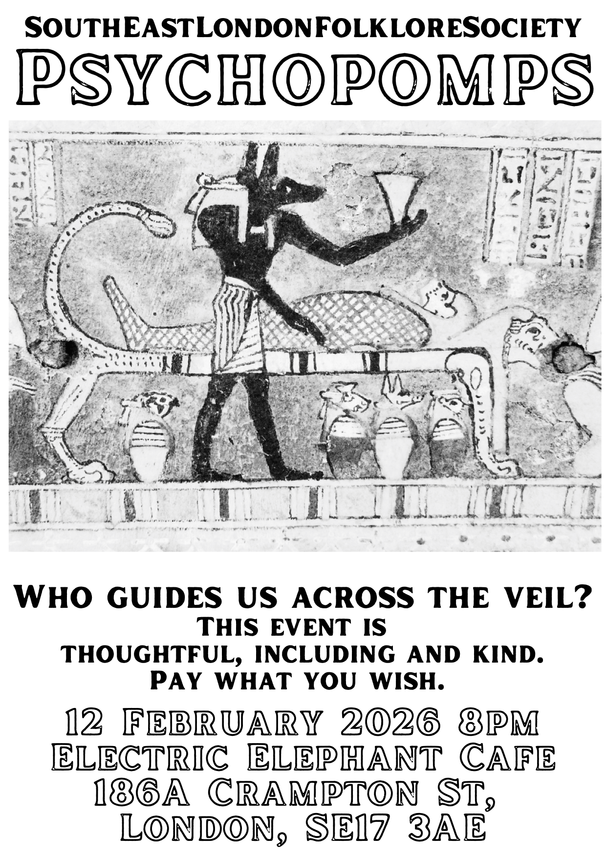 South East London Folklore Society meets on the second Thursday of the month at 8pm upstairs at The Electric Elephant Cafe 186A Crampton St, London SE17 3AE. The nearest underground stations are Kennington & Elephant & Castle.